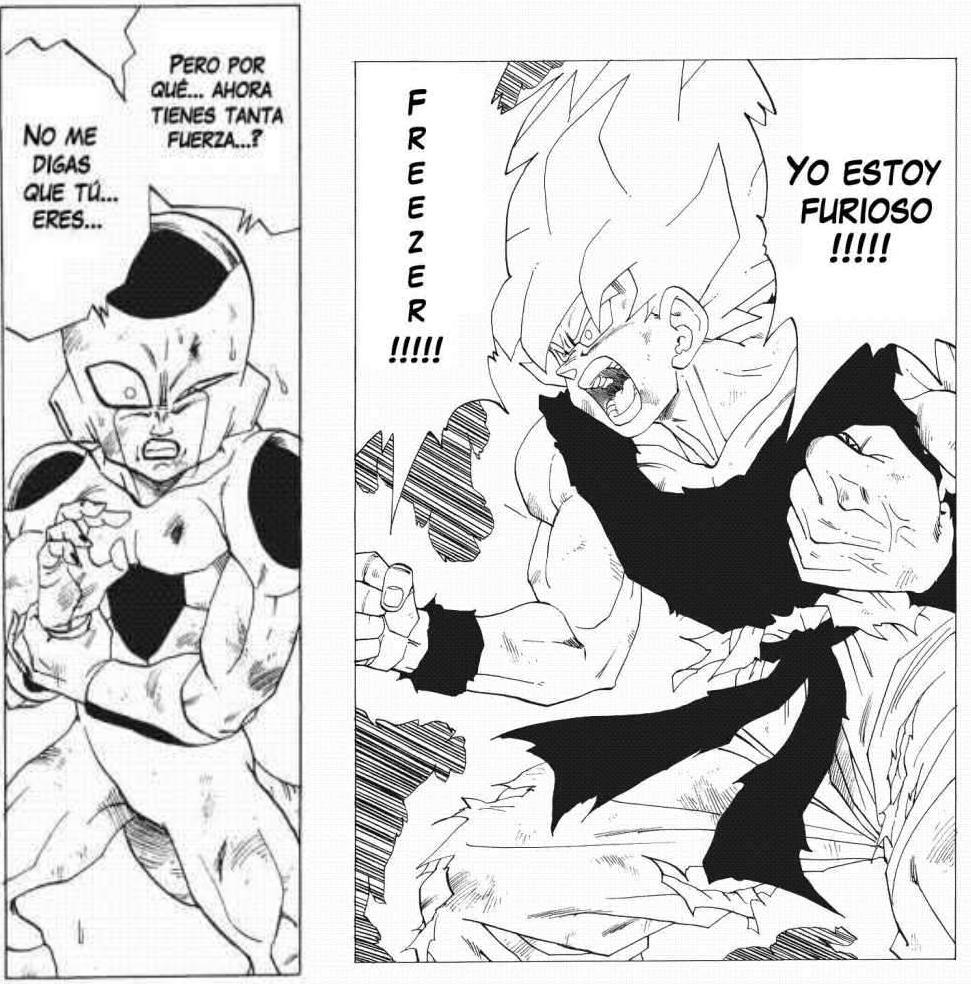 Es admirable cómo han representado esta icónica escena donde Freezer se da cuenta que se encuentra frente al Super Saiyanjin y Goku se deja llevar por la Furia que le otorga esta transformación.